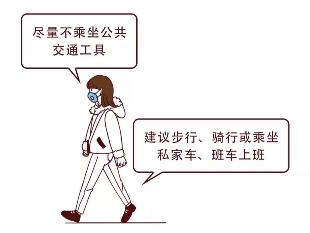 建議步行、騎行或乘坐私家車、班車上班,若乘坐地鐵、公交等交通工具,出門(mén)前佩戴好口罩,隨身攜帶免洗消毒液,下車后隨時(shí)消毒。