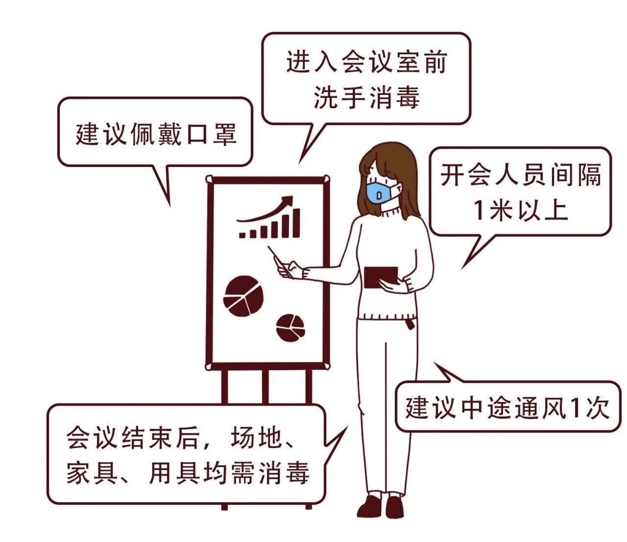 佩戴口罩,進(jìn)入會(huì)議室前洗手消毒。開(kāi)會(huì)人員間隔1米以上。減少集中開(kāi)會(huì),控制會(huì)議時(shí)間。會(huì)議結(jié)束后,場(chǎng)地、桌椅、用具均需消毒。